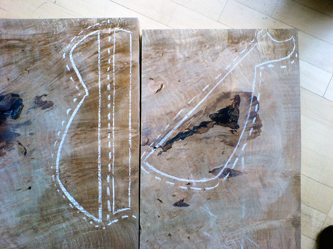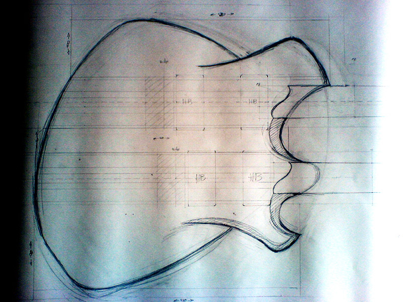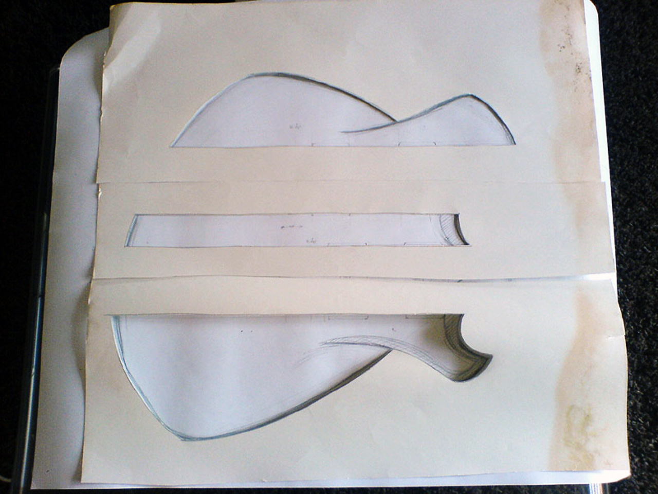 Stattdessen hab ich gestern (06.04.) damit angefangen, nen 1:1 Plan zu malen, zumindest vom Korpus. Ausgehend von diesem Plan hab ich dann Formen gemacht, mit denen ich die 3 Korpusstücke aufm Holz markieren kann.