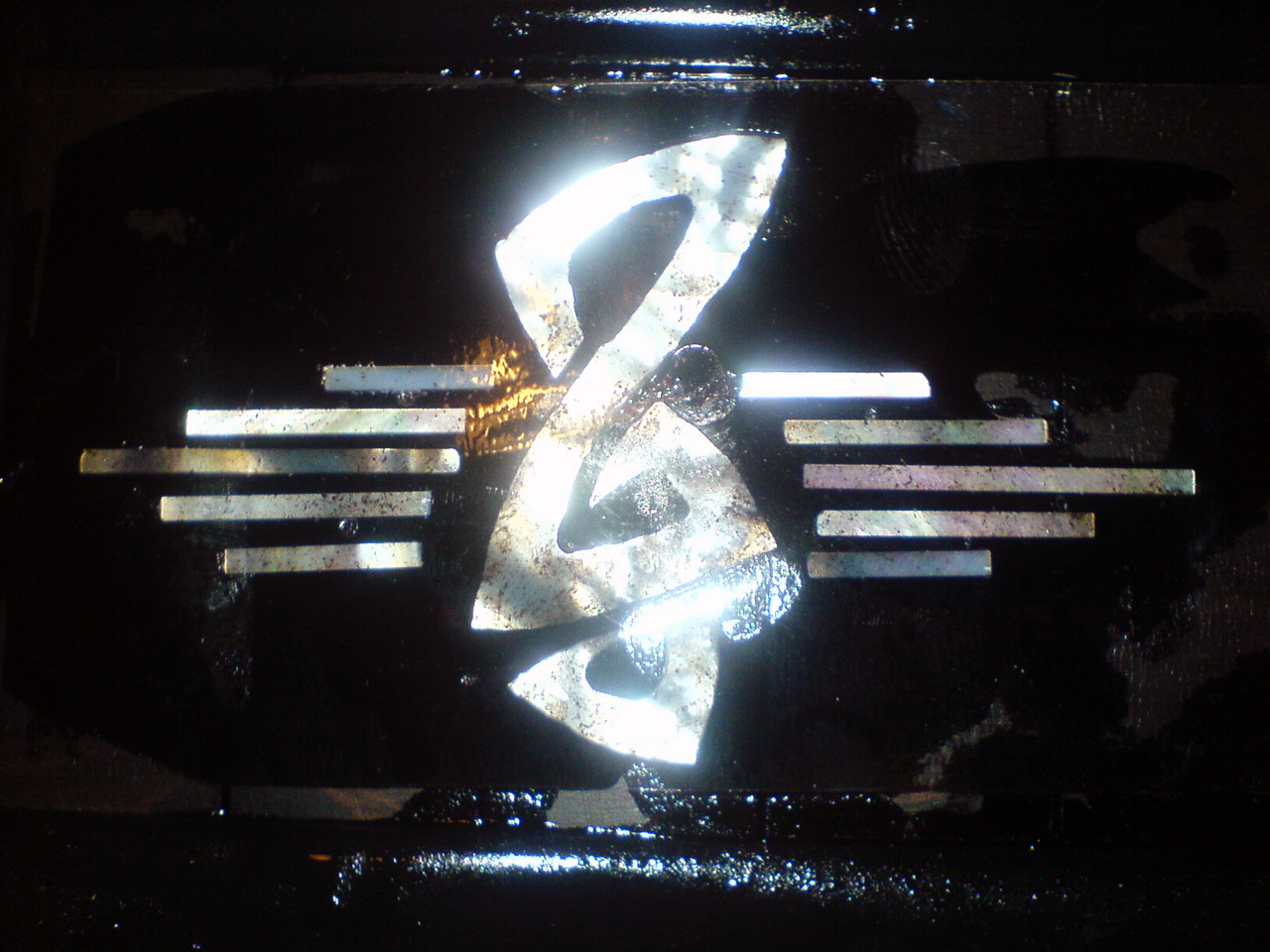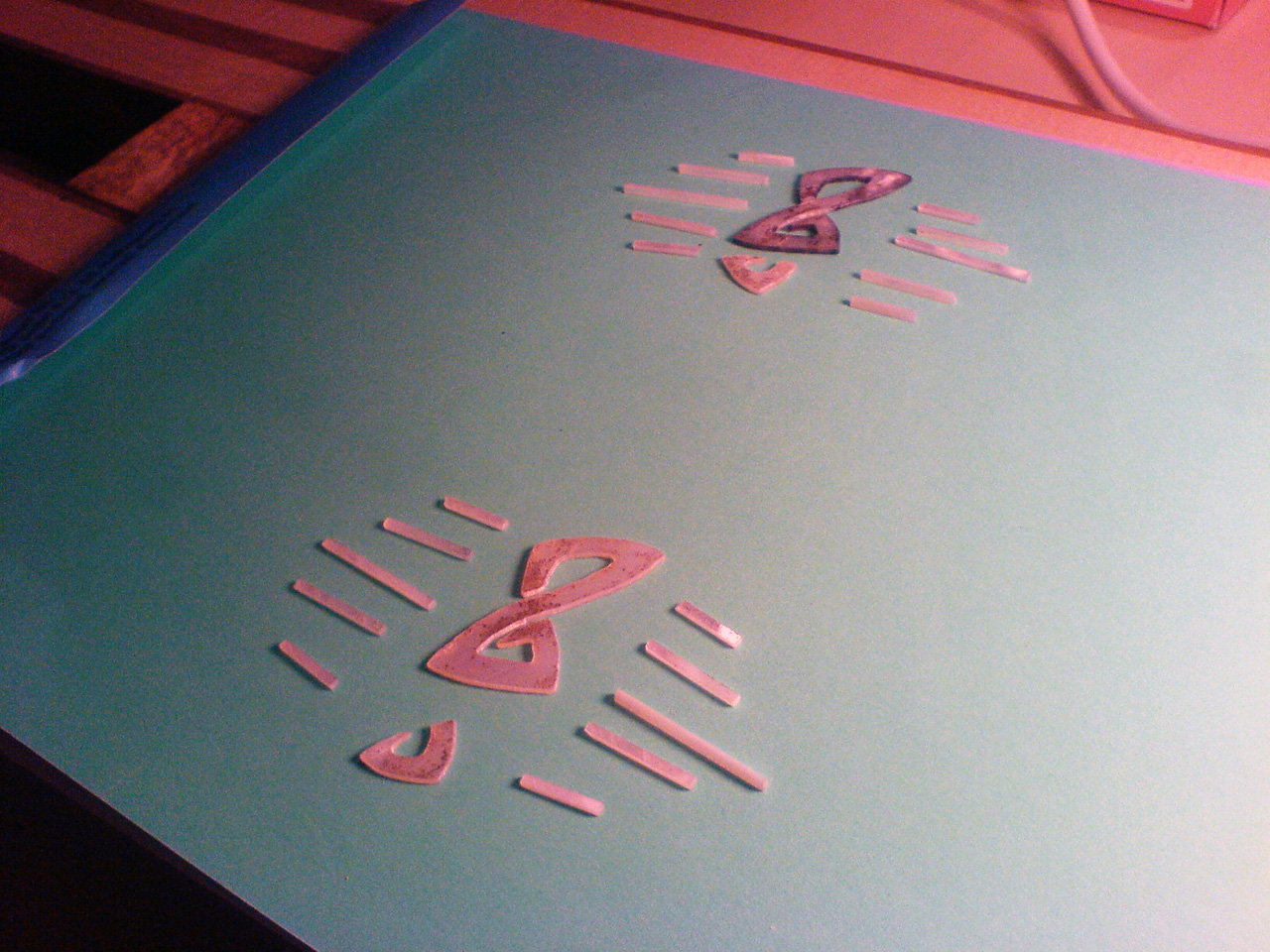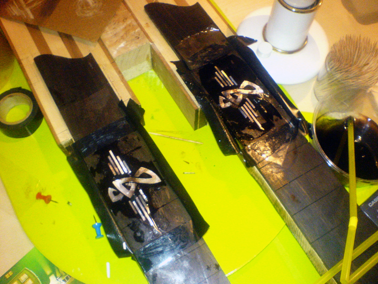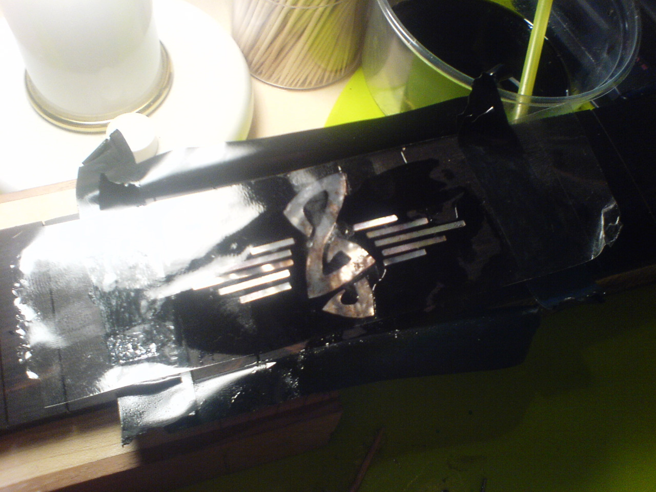 Viel problematischer ist da - wie man sich denken kann - das Versinken und Herausdrücken der Inlays. Beim Beischleifen würden die dann verschwinden. Deshalb hab ich manche Inlays mit Pappe unterfüttert. Als Gegenpol dann ganz am Schluss nen transparenten Klebestreifen druff. Hoffe das haut hin.
