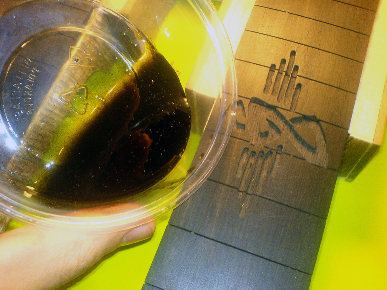 Zu diesem Zweck wurde Epoxidharz (16g) mit Härter (8,5g) und Schleifstaub vom Griffbrett-wölben gemischt. Die so entstandene Masse kam großzügig in die gefrästen Löcher und dann ging der Spaß los…