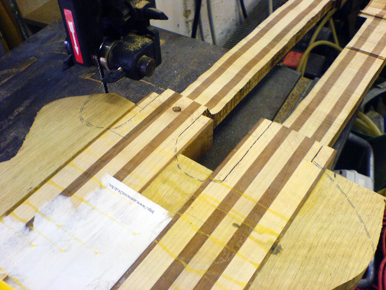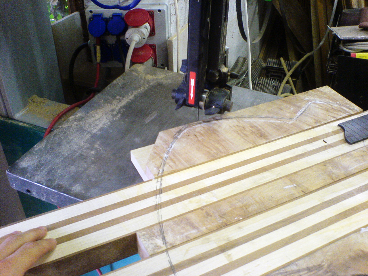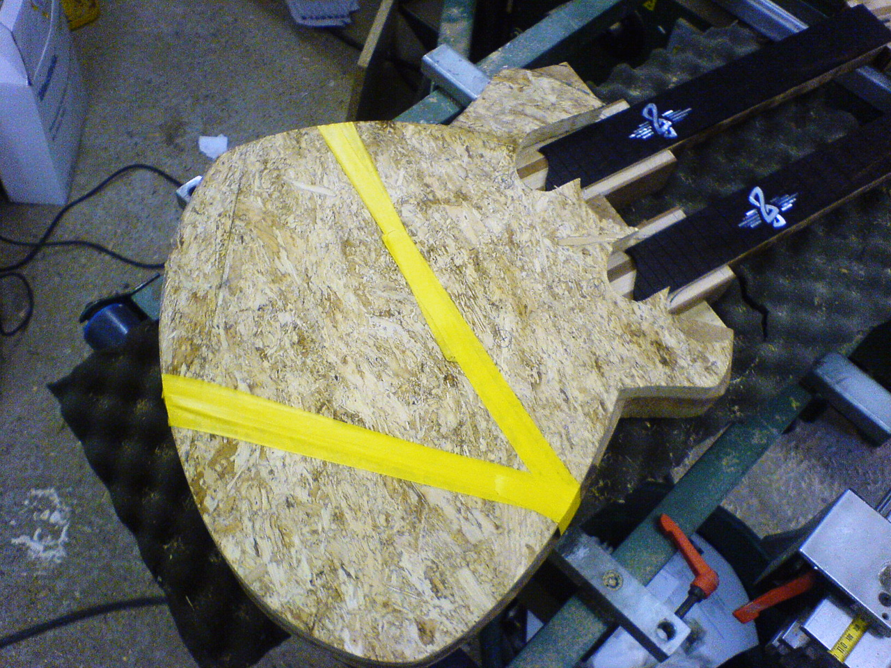 Hab ich dann direkt repariert und mitm Sägen angefangen. Die großen Konturen gingen gut, in Halsnähe allerdings stoßen die Kopfplatten beim Drehen an der Wand an. Also umgedreht und Schablone auf der anderen Seite befestigt, um die Griffbretter vor Kratzern zu schützen.