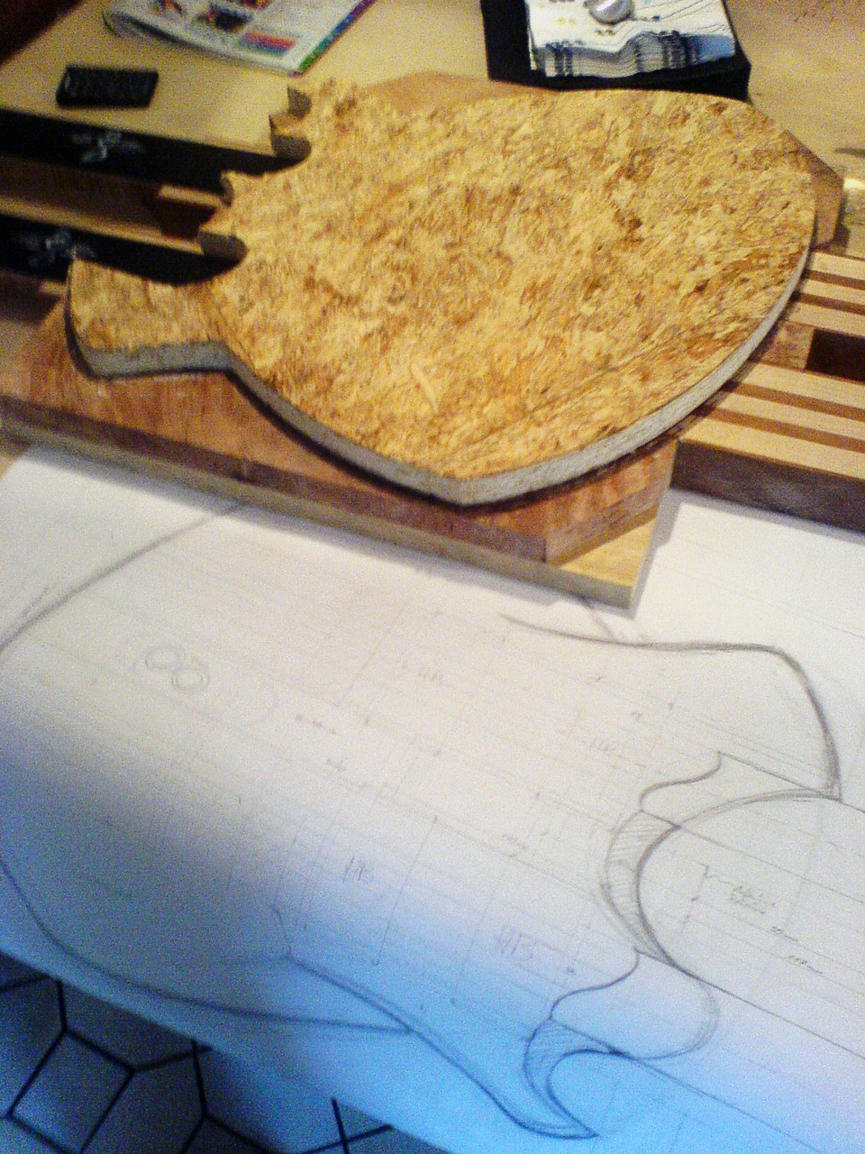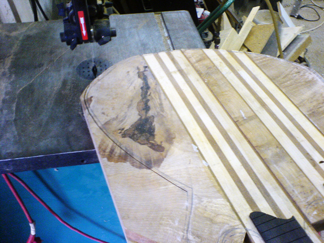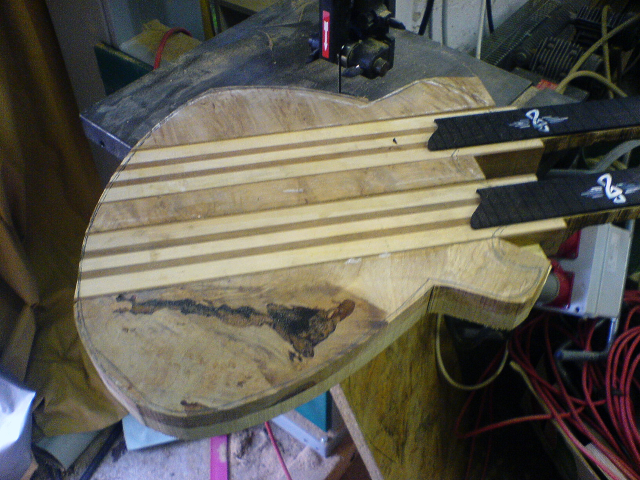 Hab ich dann direkt repariert und mitm Sägen angefangen. Die großen Konturen gingen gut, in Halsnähe allerdings stoßen die Kopfplatten beim Drehen an der Wand an. Also umgedreht und Schablone auf der anderen Seite befestigt, um die Griffbretter vor Kratzern zu schützen.