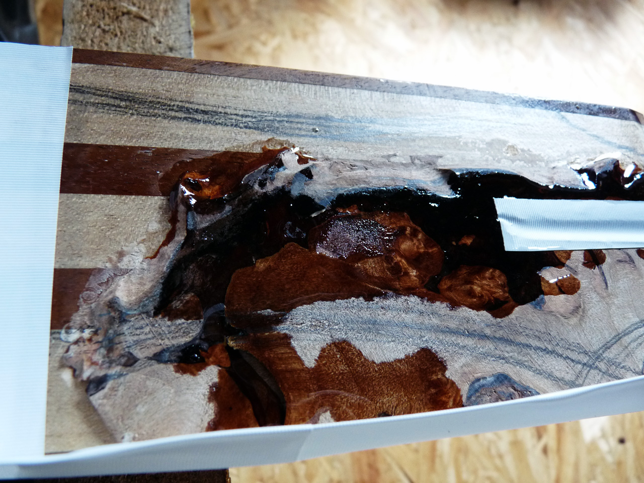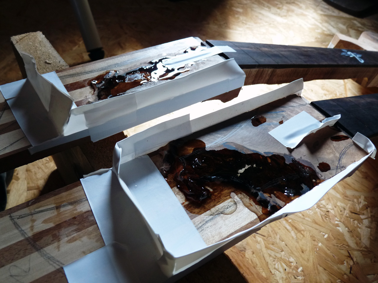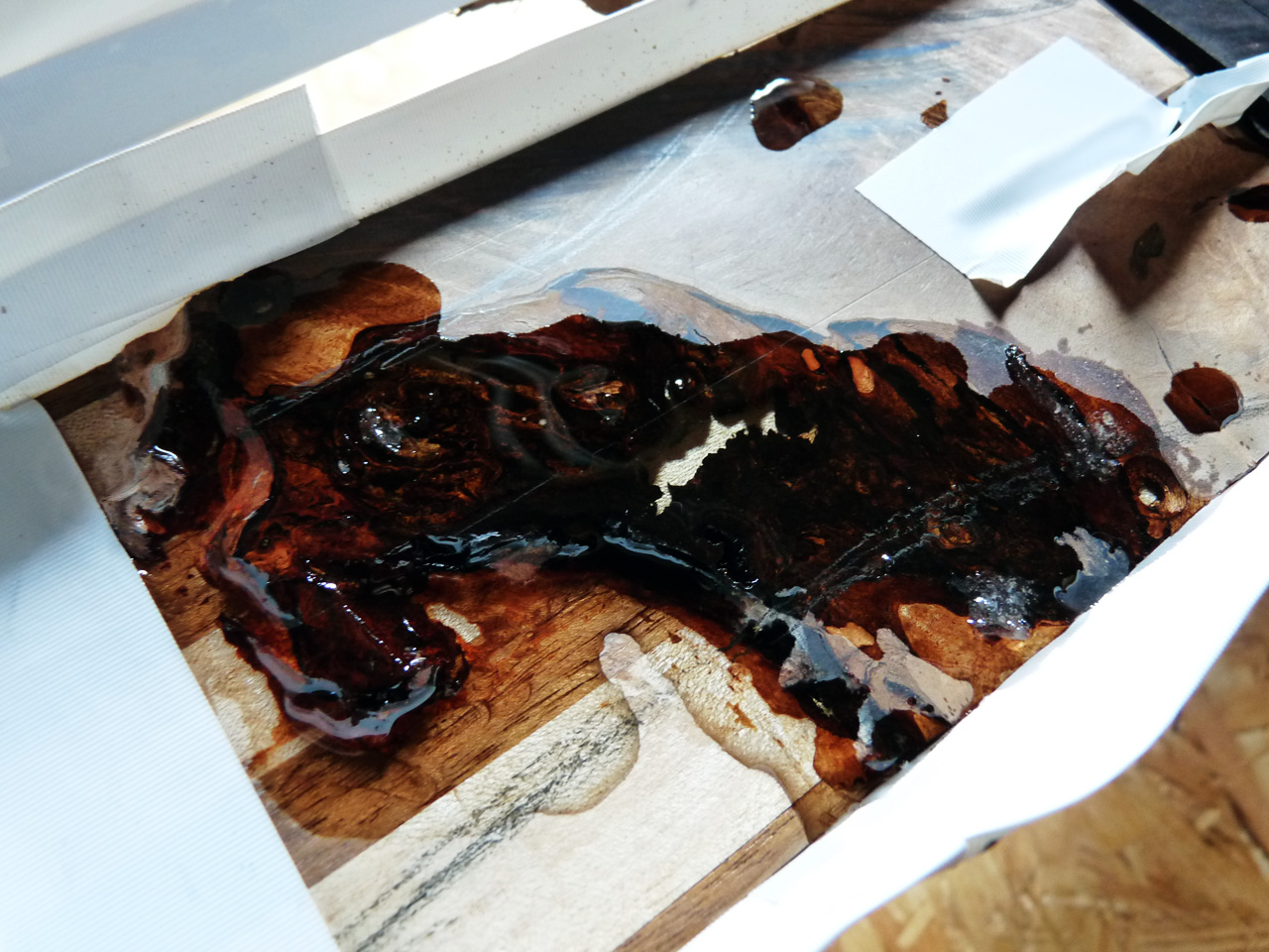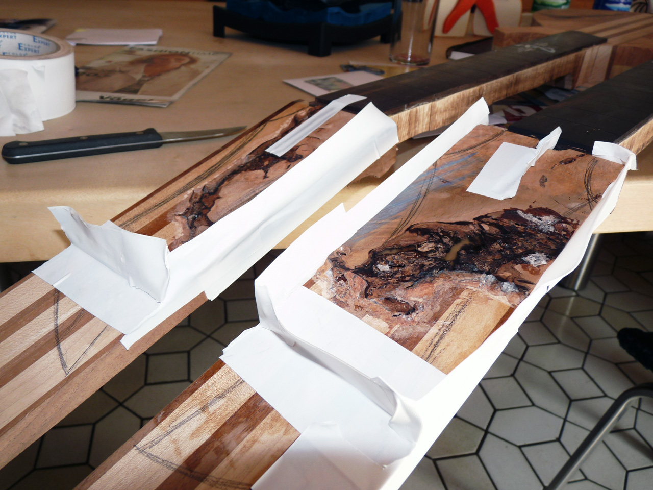 Nachdem mit Klebeband kleine Mäuerchen auf die Kopfplatte gesetzt wurden, hab ich Harz angemischt und damit die letzten verbleibenden Löcher ausgegossen. Ich hoff, das wars jetzt langsam mal. Doofe Löcher.