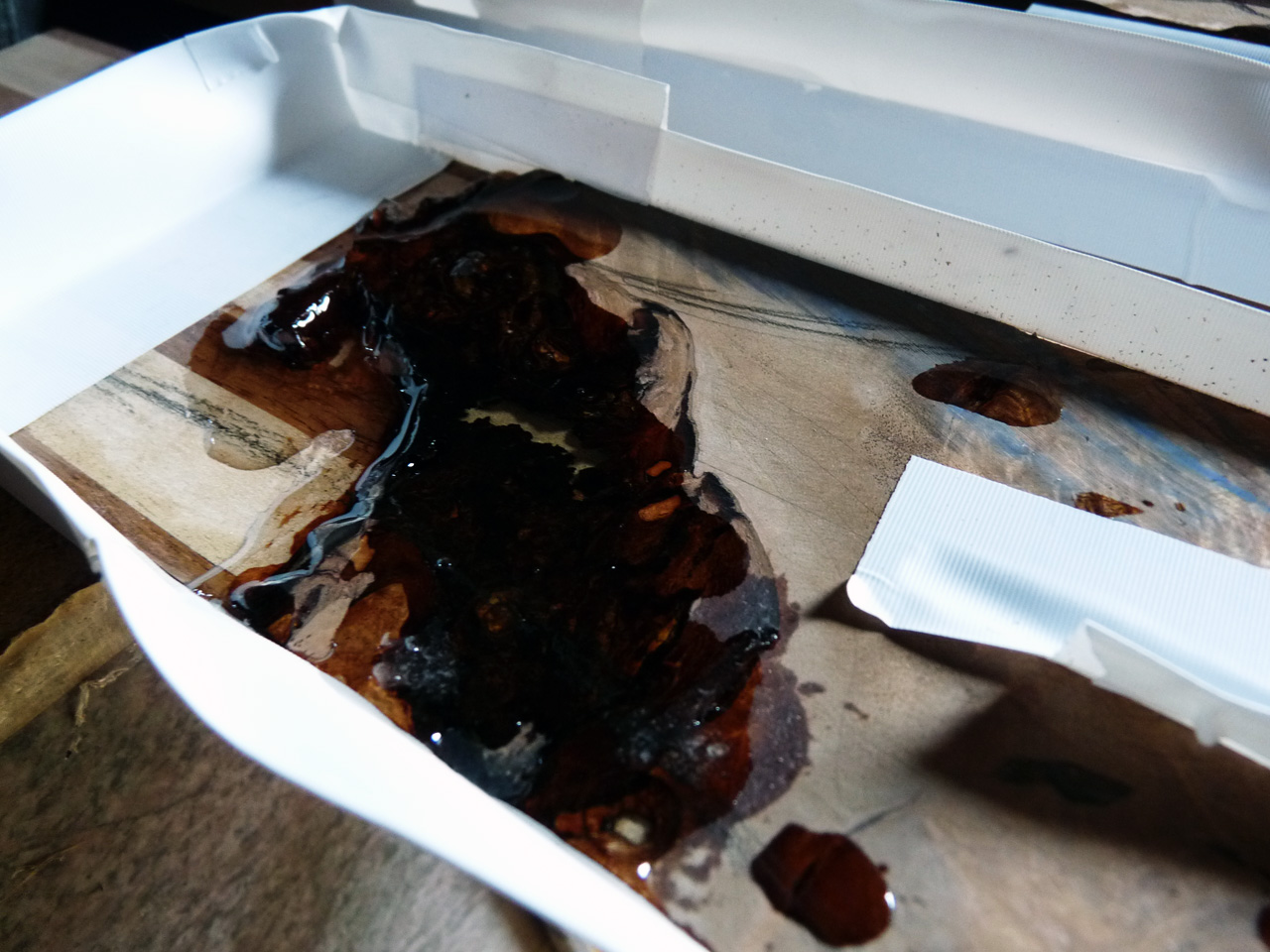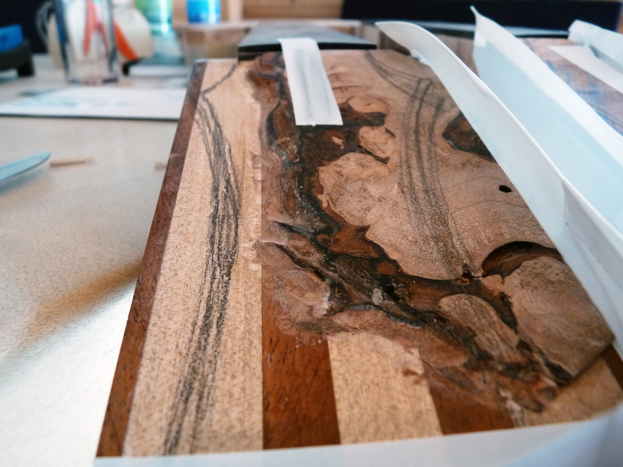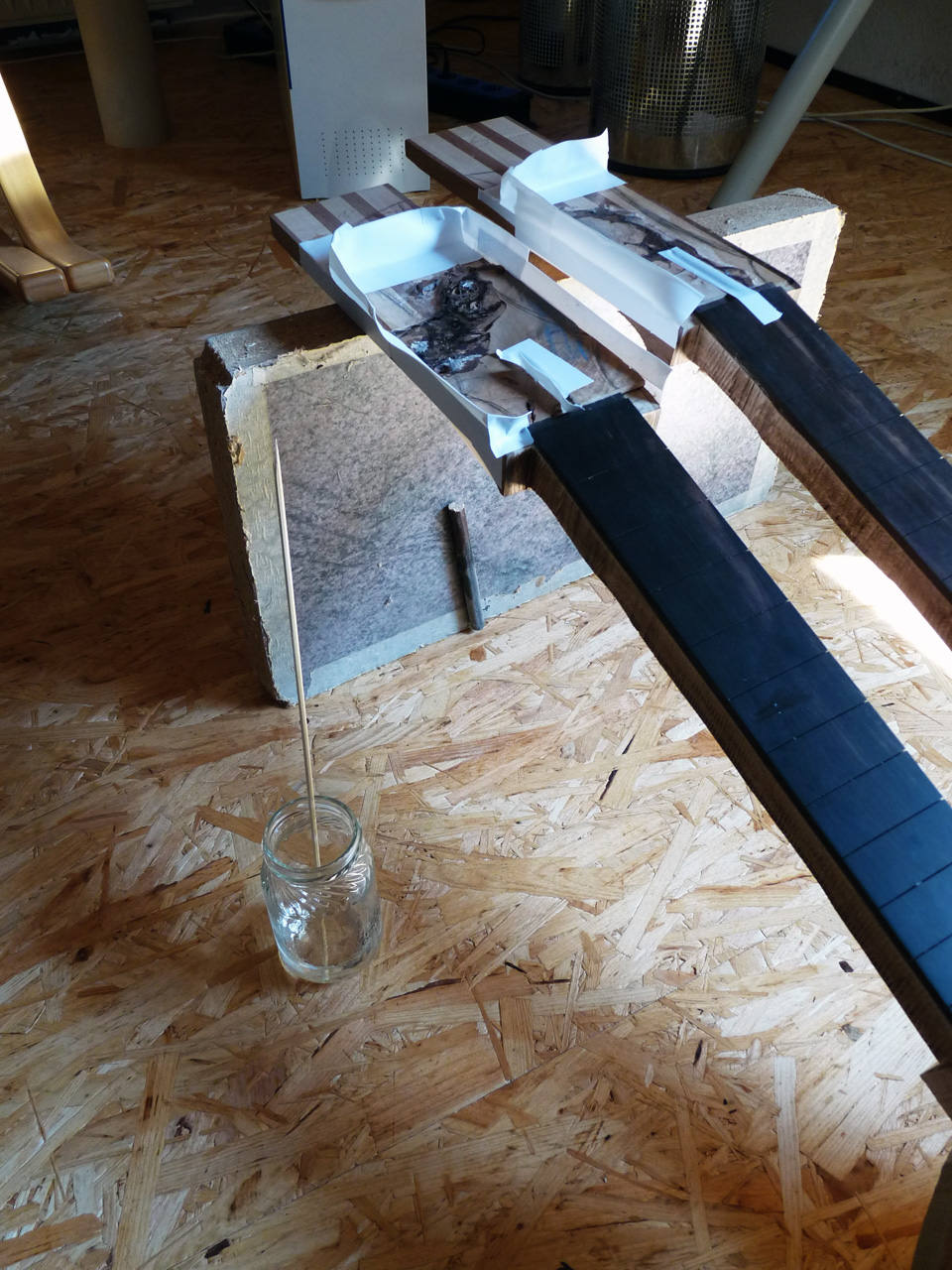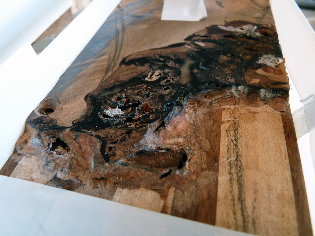 Nachdem mit Klebeband kleine Mäuerchen auf die Kopfplatte gesetzt wurden, hab ich Harz angemischt und damit die letzten verbleibenden Löcher ausgegossen. Ich hoff, das wars jetzt langsam mal. Doofe Löcher.