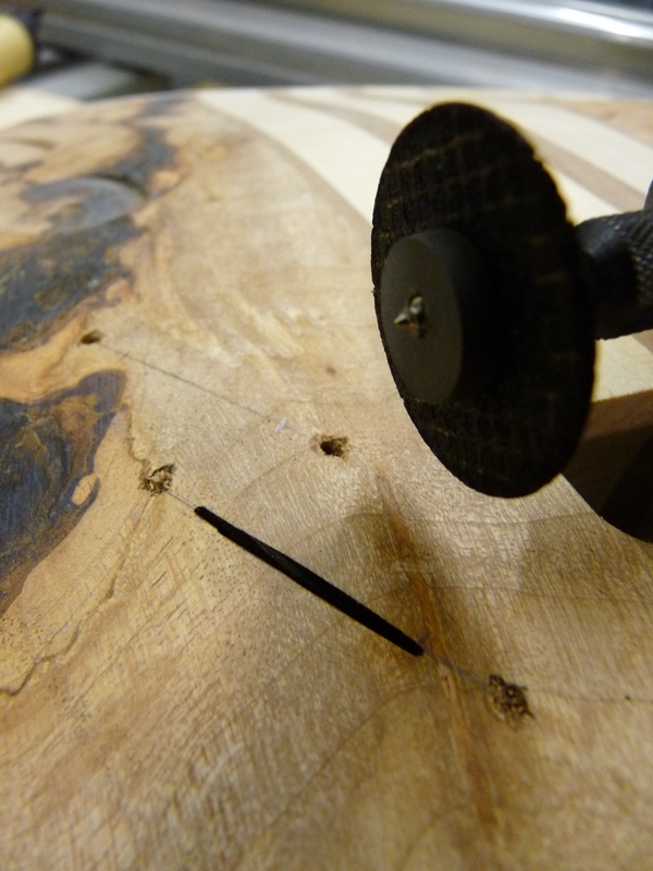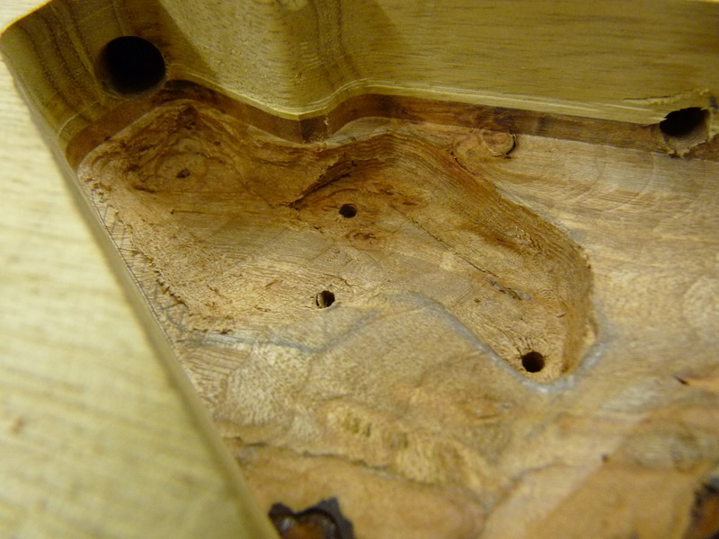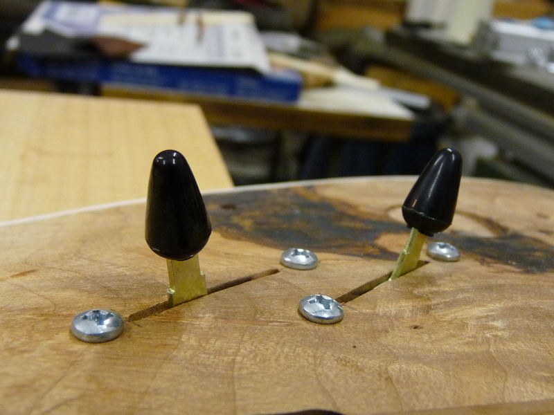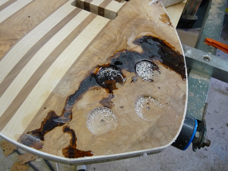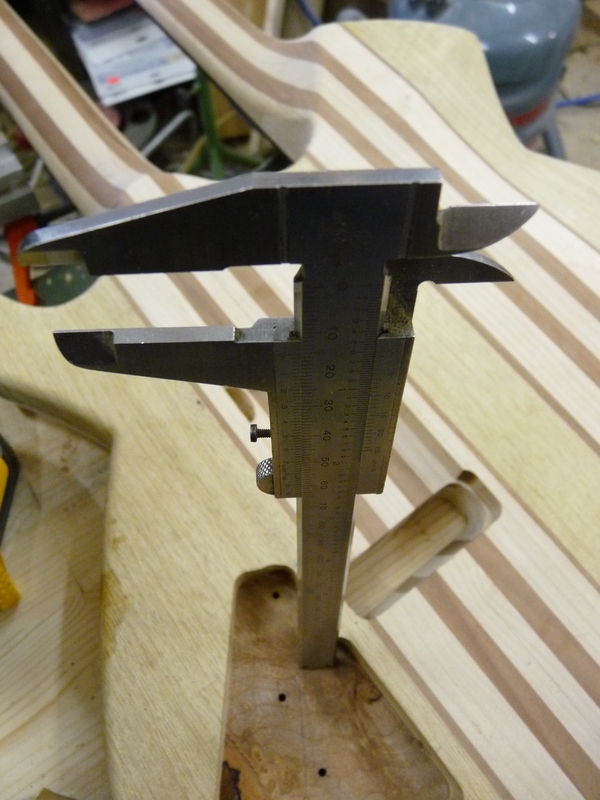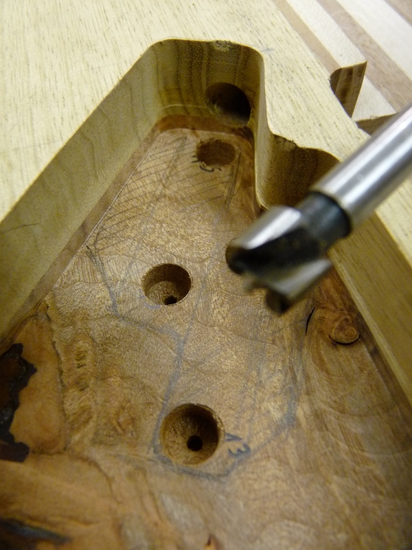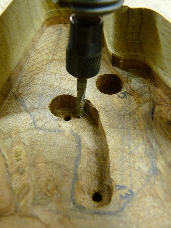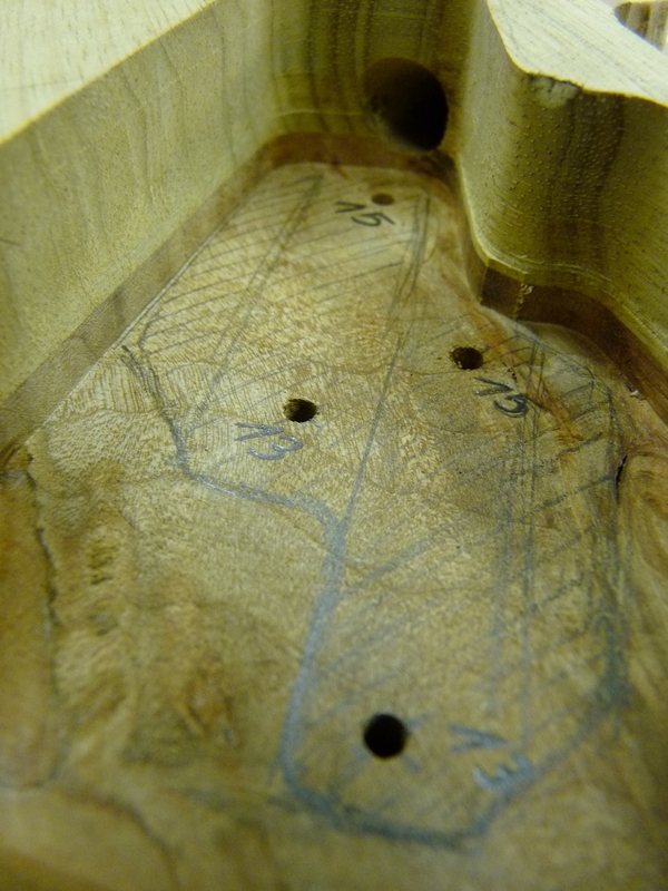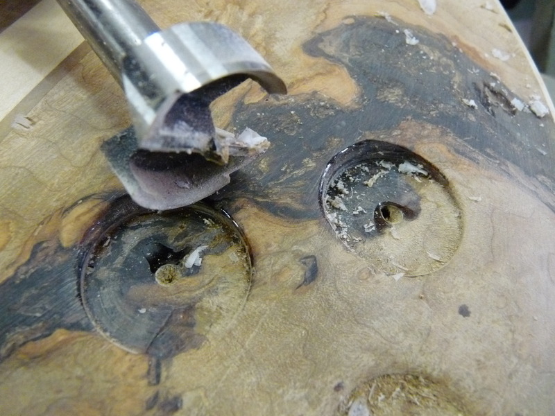 Die Harzschicht aufm Korpus wird geschliffen, die beiden betroffenen Poti-Stufen per Forstnerbohrer geplant. Weils grad so schee is und endlich mal Zeit wird, mach mer gleich weiter mit den Schalterschlitzen. ERstmal ne kleine Schablone gemacht und die Befestigungslöcher gebohrt. Hält man jetzt die eine Seite zu, kann man von der anderen mitm Messchieber durchmessen und weiß dann wieviel weg muss. Das war (glücklicherweise) recht viel, die Drecksschalter ham nämlich ne Einbauhöhe von ca. 35 mm.