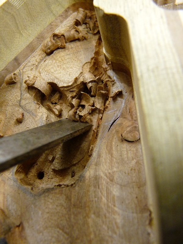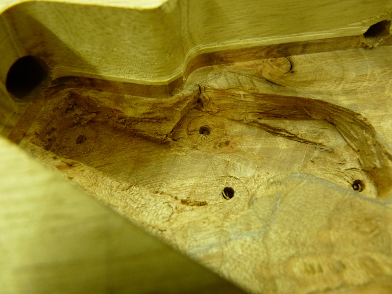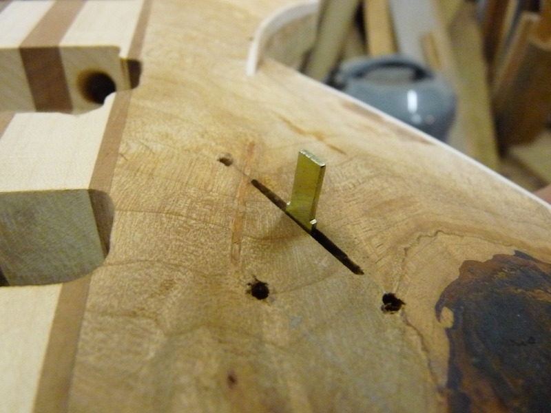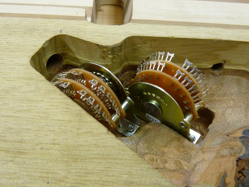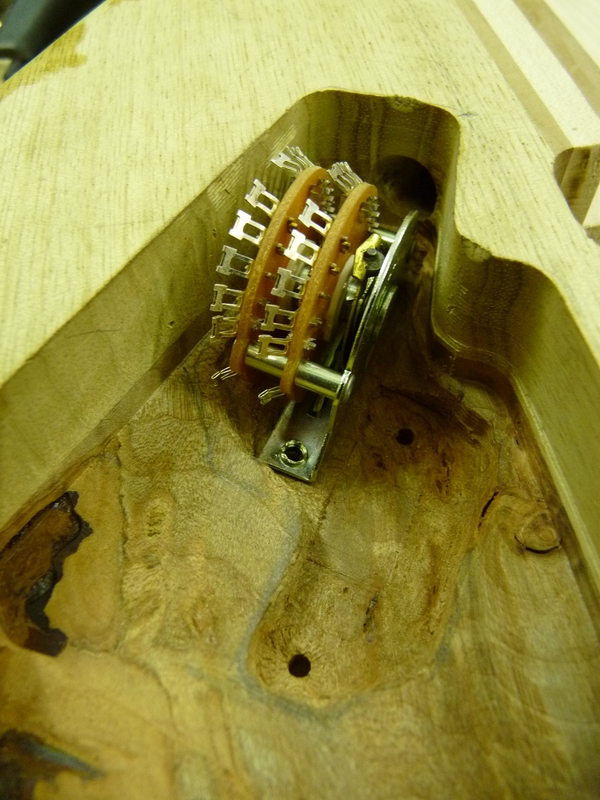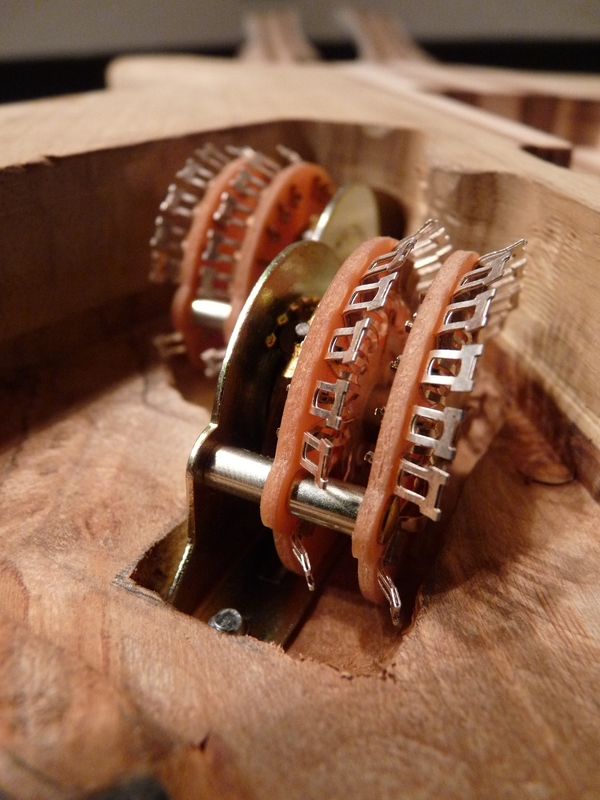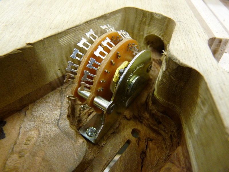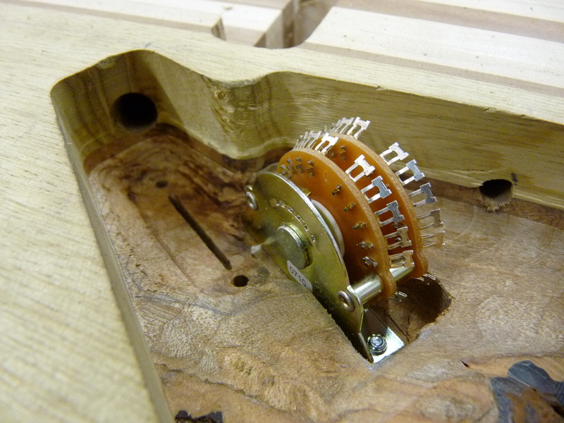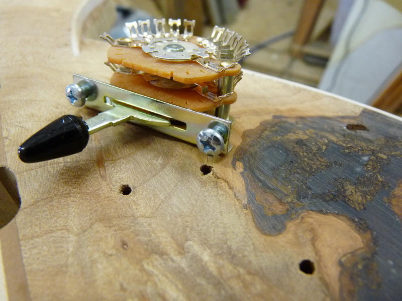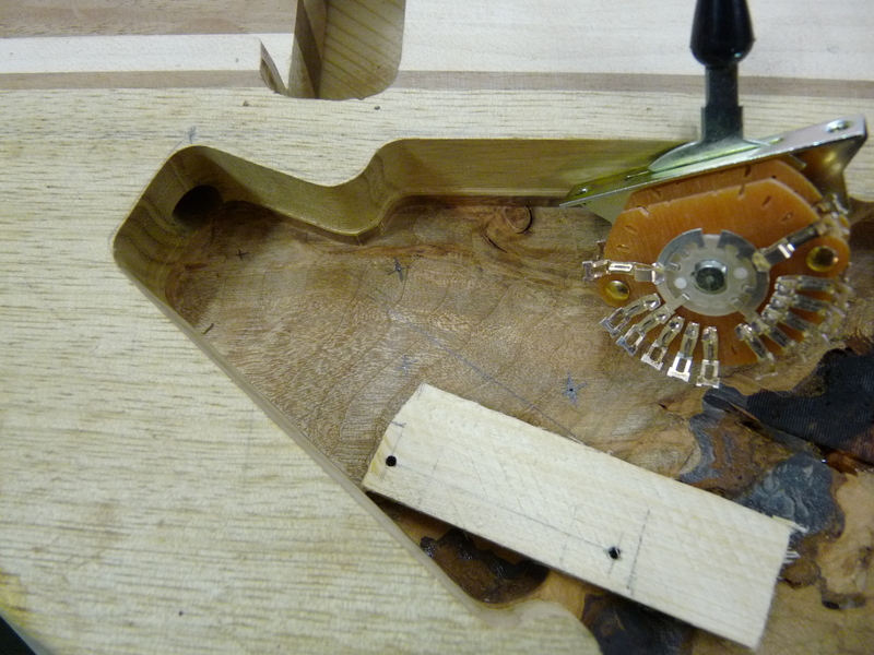 3mm sind nicht sooo viel, weshalb ich hier massiv vorsichtig bin. Schlussendlich fräs ich sogar am Schalter einen Teil (nutzlos) der Platine weg, weils mir einfach ZU riskant wird. Die Superswitches bauen verdammt breit, und wenn der Anhang dann auch noch in Richtung des abfallenden Archtops zeigt…ouhauerha! Aber hat ja geklappt \o/