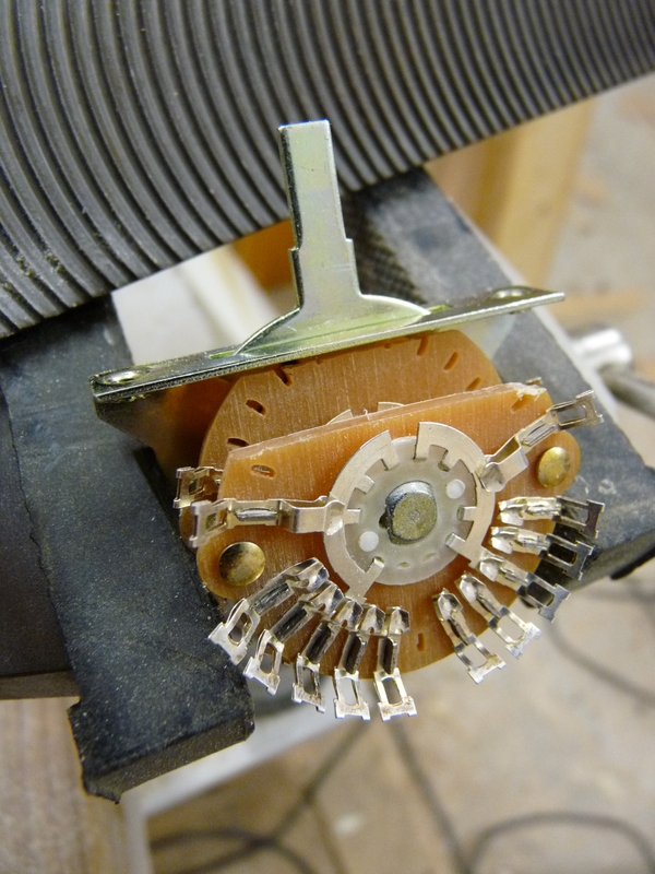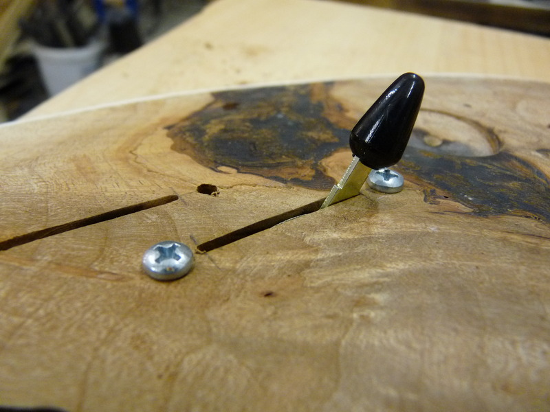 Das überschüssige Material wird per Forstner, Dremel und Stechbeitel entsorgt, wobei letzterer sich verdammt gut eignet um die Ebene für den Schalter herzukriegen. Schleifen ist bei den beengten Verhältnissen ja quasi unmöglich. Sobald die Dicke der Decke auf 5 mm abgesunken ist, kommt die Trennscheibe aufm Dremel zum Einsatz und beschert mir einen schönen, geraden Schnitt für den Kipphebel. Dieser ist zu schmal, kann aber gut mit Laubsäge, Dremel (1 mm Fräser) und Schleifpapier verbreitert werden.