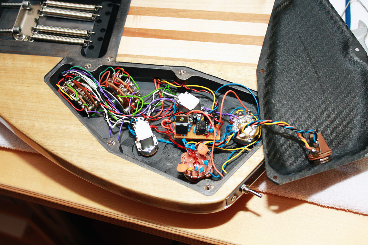 Immerhin hab ich aufm Weg vom Guitar-Service Karlsruhe noch 2 Vibratofedern geholt. Das Vibrato am 6er Hals kann damit endgültig montiert werden, und der Deckel geht jetzt auch wieder zu, weil ich die Federkammer bissl abgeschliffen hab. Das ging vorher eigentlich auch ohne, keine Ahnung was sich da geändert haben soll. Egal, jetzt passts ja wieder. Und eng wars eh schon immer, so what.