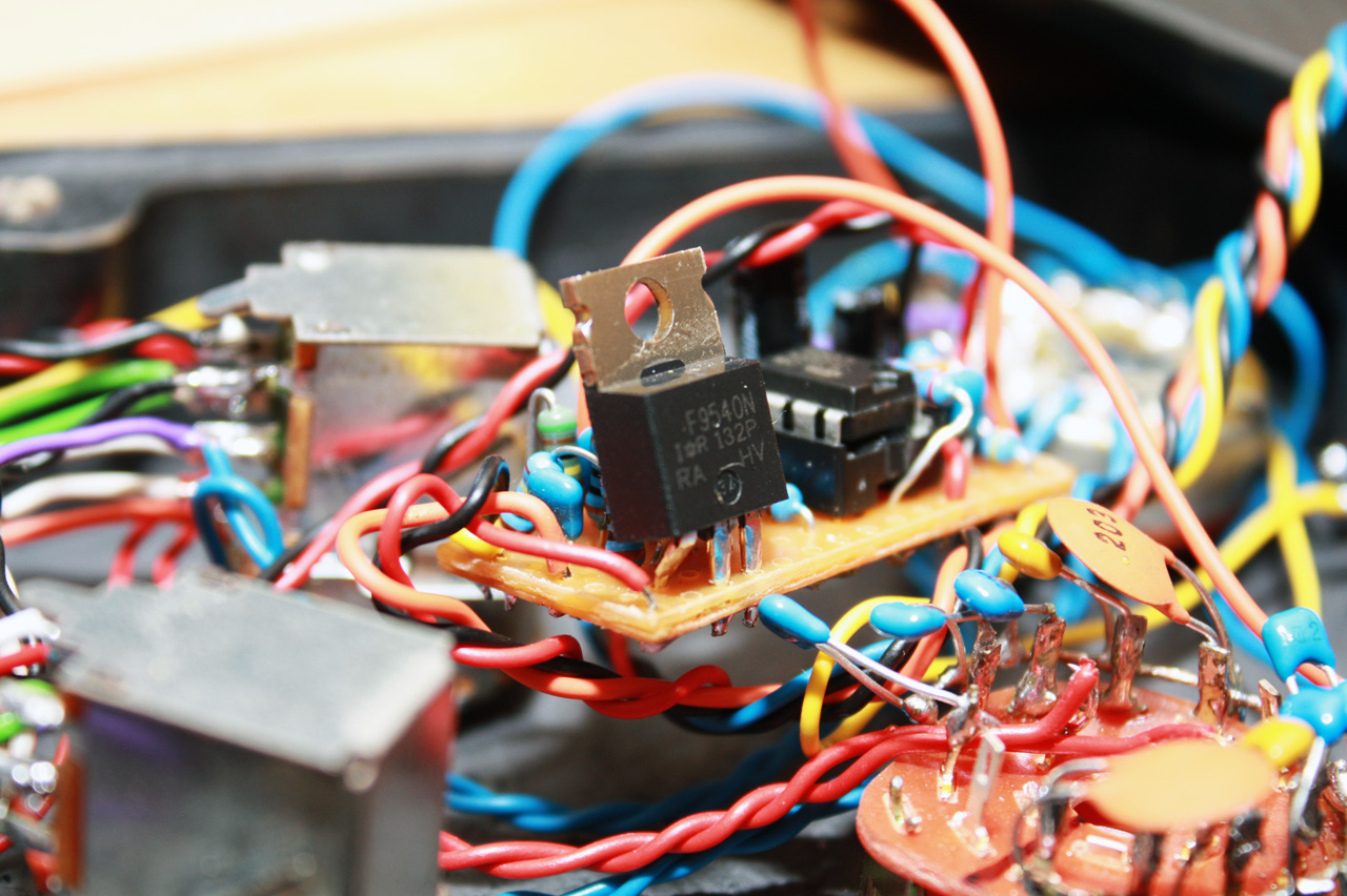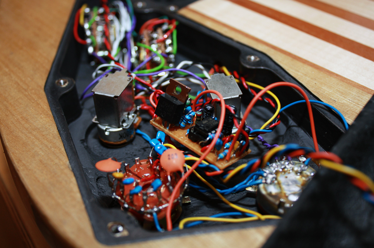 Zusätzlich zum linearen 100K-Trimmpoti also noch ein 500K-Poti reingelötet, hat man ja eh rumfliegen. Rumprobiert, bis beide Tonabnehmergattungen ca. gleich laut waren und gemessen – 350 kOhm (über beide Potis natürlich). Das entspricht einer Verstärkung von 36. Ziemlich kräftig. Aber da kein Kratzen wahrnehmbar war, passt das schon ^^