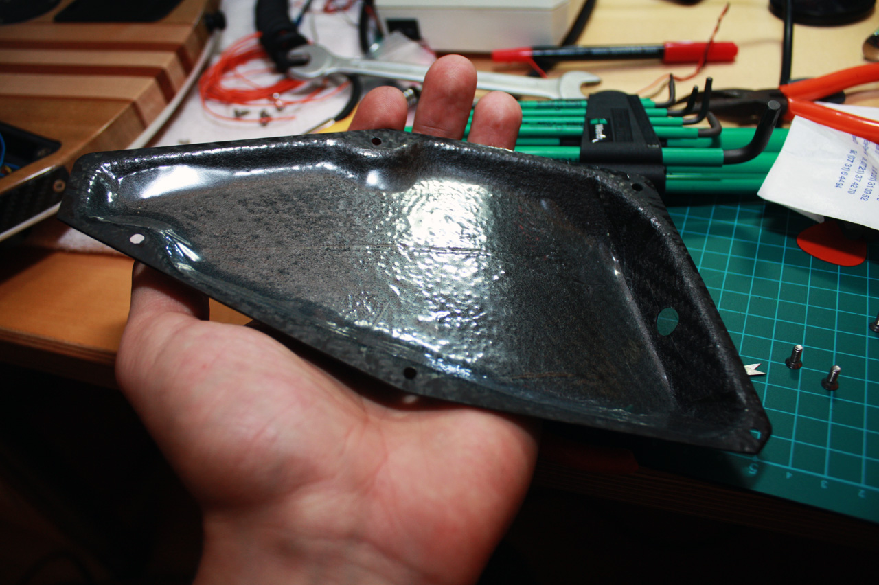 Kurzer Test vorm Zumachen des E-Fachs, passt. E-Fach zumachen wirft das nächste Problem auf, die Buchse is scheisse. Das Gewinde is unter aller Sau, wieder Billigschrott gekauft. Egal, wird irgendwann ersetzt. Allerdings musste die Carbonabdeckung auf der Innenseite auch Folie bekommen, damit die Kontakte der Buchse auf keinen Fall das Carbon berühren. Das Zeug ist nämlich leitend, und „hot“ direkt auf Masse zu legen ist nur äußerst selten Zielführend.